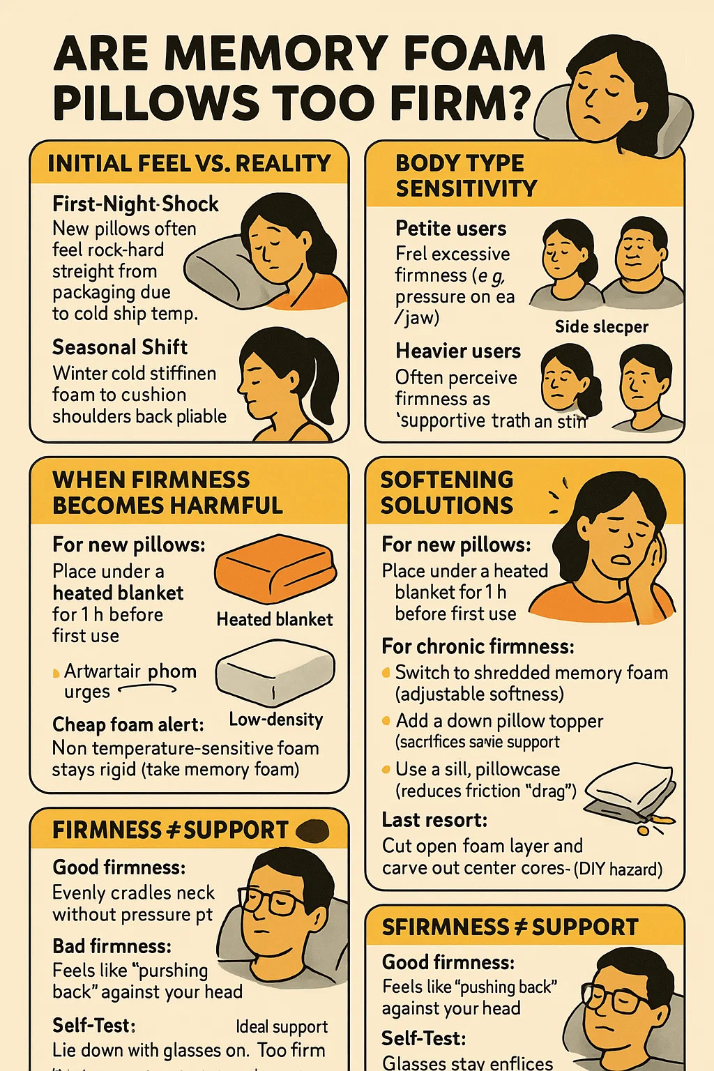 For chronic firmness: → Switch to shredded memory foam (adjustable softness). → Add a down pillow topper (sacrifices some support). → Use a silk pillowcase (reduces friction "drag").