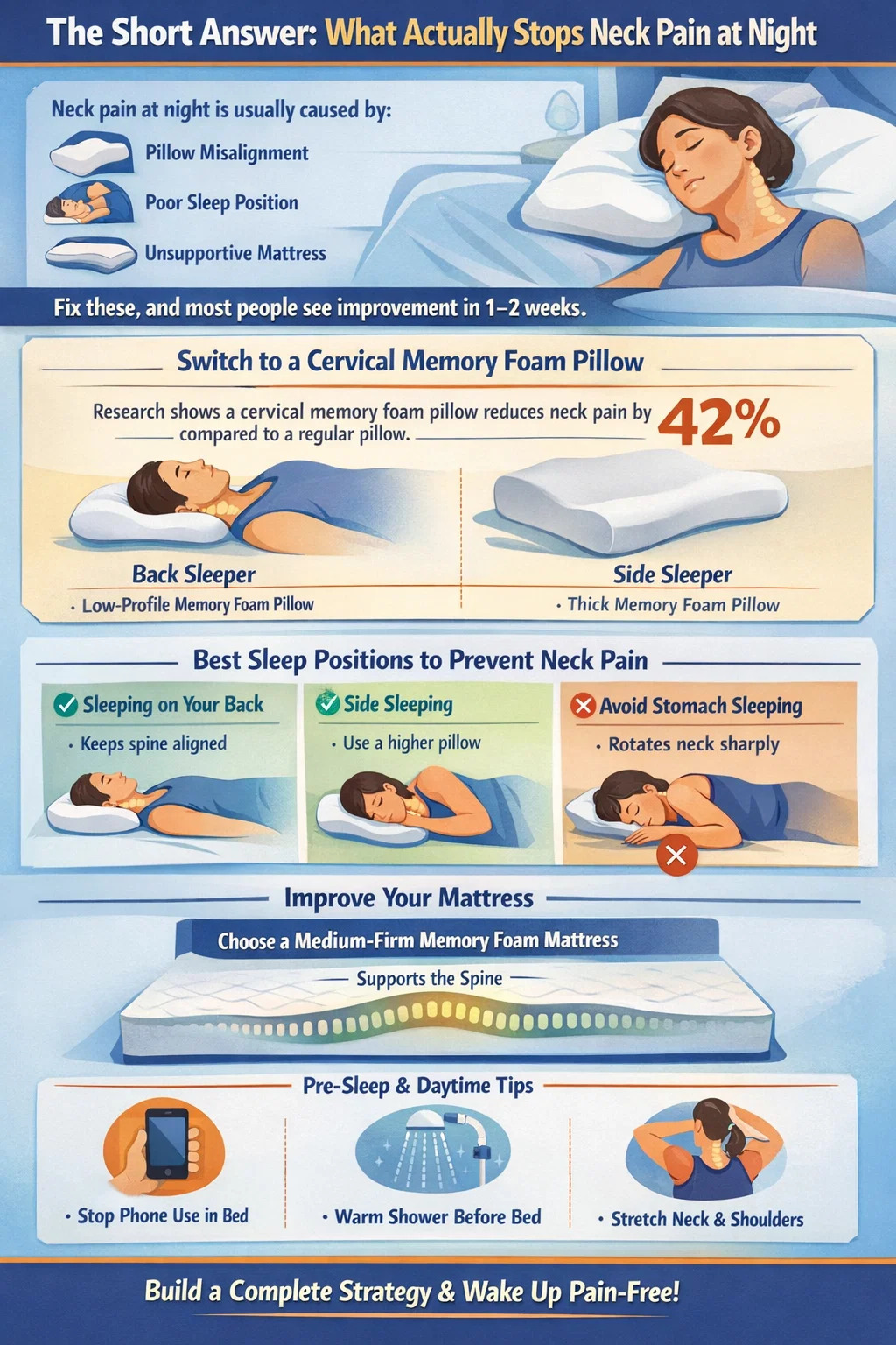 The single most effective change the majority of people can make is switching to a memory foam pillow sized correctly for their sleep position. Research published in the journal Complementary Therapies in Clinical Practice found that participants using a cervical memory foam pillow reported a 42% reduction in neck pain intensity compared to those using a standard polyester-fill pillow over an eight-week trial. That alone tells you where to start.